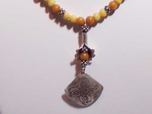 Hourglass-shaped Aragonite and Round Yellow Jade Gemstone Beaded Necklace with Hill Tribe Silver Trumpet Flower and Etched Floral Shield Pendant and Bali Silver Accents. A Bali Silver Toggle finishes the piece.