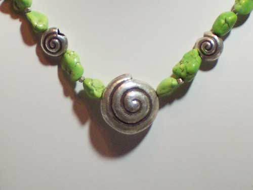 Gaspeite Nugget Gemstone Beaded Necklace with Faceted Hill Tribe Nugget Accents. Both large Shell Pendant and smaller Shell Beads are handmade Hill Tribe Silver pieces. A small sterling silver toggle finishes this piece.