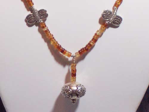 Heishi Hessonite Garnet and Karen Hill Tribe Silver Bee Beaded Necklace with Karen Hill Tribe Silver Embossed Flower Bead Pendant and Bali Silver Rectangle Beaded Accents. A Karen Hill Tribe Silver Embossed Flower Toggle finishes the piece.