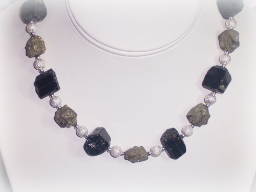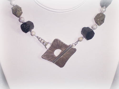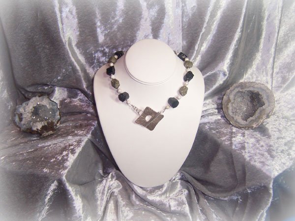 "Black Hills Gold" is a new piece inspired by the texture of the two stones used, but it was the toggle of this piece that ties it all together. The toggle is a handmade piece from the Karen Hill Tribe Silversmiths of Thailand. The name of the toggle is called the "Northern Star". (Thai Silver is .998 silver.) The stones used in this piece are Black Tourmaline or Schorl chunky, free-form nuggets and Pyrite or Fool's Gold chunky, free-form nuggets. Both are covered in small druzy crystals that add a extra dimension of sparkle to this necklace.