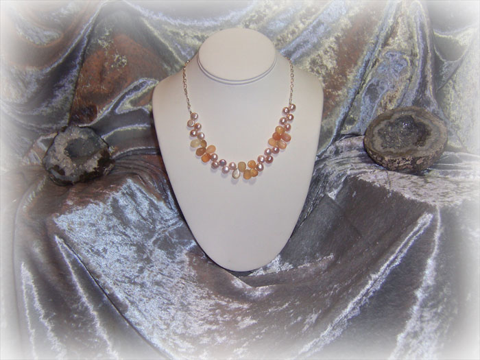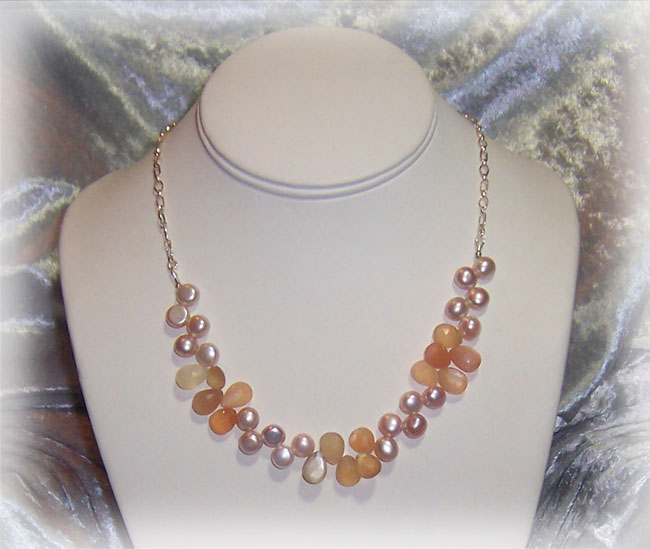 Cream colored Freshwater Button Pearls and Rainbow Peach Faceted Briolettes Sterling Silver Curb Chain Necklace is a sweet reminder of a Spring Wedding. A Sterling Silver Toggle completes the piece.