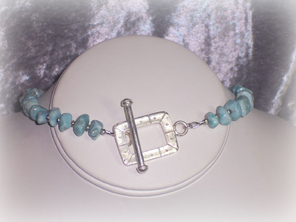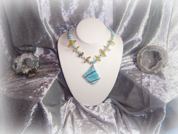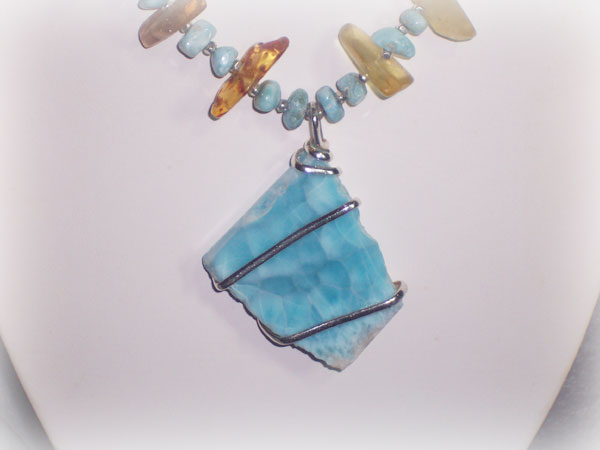 "Port of Atlantis" is a new piece inspired by my fool-hardy fascination with all things ancient and very hard to find. (Thus my obsession with gemstones.) When I first saw the pendant that is the focal point for this piece, I knew I had to have it. It stood out in a literal sea of other Larimar pendants, and that is something very hard to do since Larimar is such a beautiful and unusual stone. The pendant reminded me of an illustration I had once seen of the lost city/island of Atlantis. It is handwrapped in sterling silver wire by the person I purchased it from. The Amber in this piece gets its coloring from being under saltwater for millions of years. The Larimar nuggets reminded me of bubbles coming up from ocean floor. Larimar is a rare stone found only in the Dominican Republic.