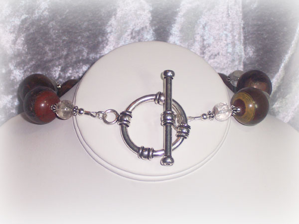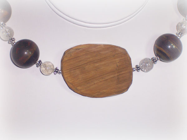 "Tiger Wood" is a piece I made totally by accident. I had bought each strand of beads separately. In the case of the Petrified Wood, I had made that purchase a whole year ago. Then earlier in November I was rummaging through my "goody" box and started picking out orphan strands and placing them around each other. To my surprise, these huge Tiger Iron beads seemed to go with the Cracked Crystal Quartz. They complimented each other in such a great way that I just had to put them together. And, when I added the Petrified Wood piece as a pendant, I knew what the name of the piece had to be.